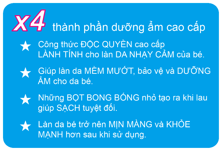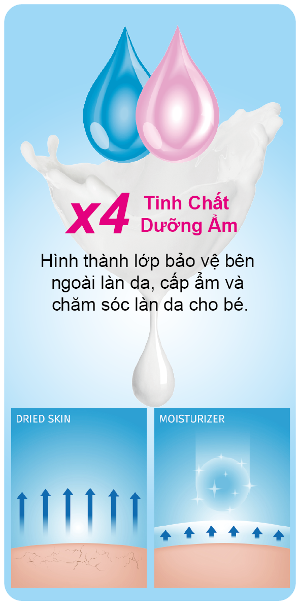 Công thức độc quyền với bong bóng dưỡng ẩm hoàn toàn an toàn và nhẹ dịu cho da, giúp lau thường xuyên mà không gây khô, ngứa cho da, giữ ẩm và cân bằng độ ẩm.